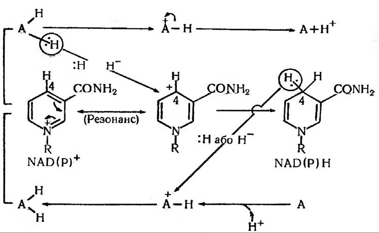 Таким чином, НАД(Ф)+ та НАД(Ф)×Н+ відрізняються наявністю або відсутністю одного гідрид-іону, який еквівалентний двом електронам та одному протону Н+. Звідси легко зрозуміти, чому НАД та НАДФ відносять до переносників водню та двохелектронних окислювально-відновних сполук. Необхідно враховувати, що НАД і НАДФ можуть приймати водень і електрони лише у тих випадках, коли субстрат має більш від’ємне значення потенціалу в порівнянні з ними.