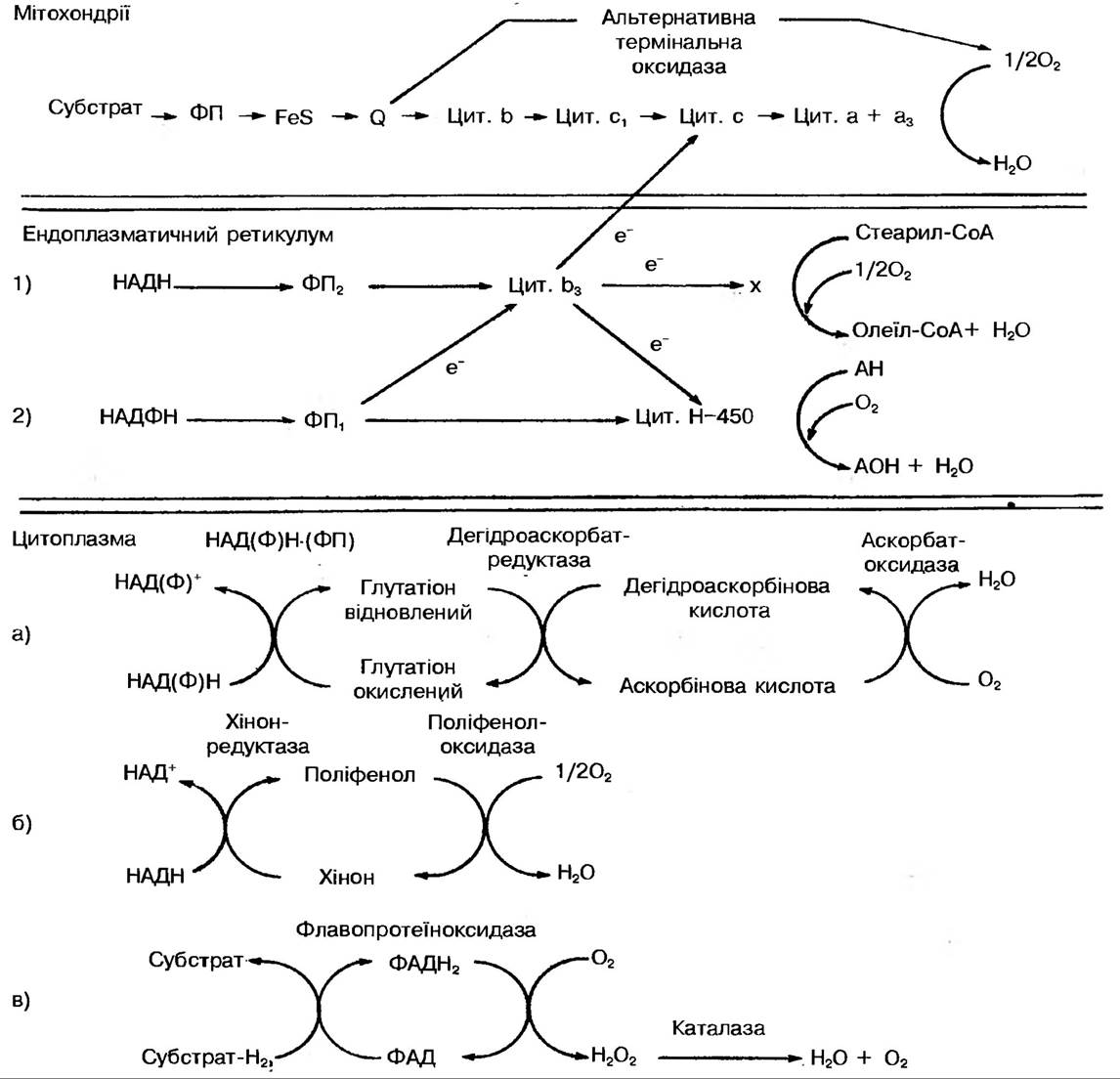 Окислювальний апарат рослин характеризується своїми специфічними особливостями. Насамперед, на відміну від тварин, для нього характерна делокалізація дихального апарату (Мітохондрії, пероксисома, Цитоплазма та ін.). По-друге, для нього характерна поліфункціо- нальність, тобто наявність каталізаторів, що характеризуються багатьма властивостями. Нарешті, для окислювального апарата рослин характерний принцип, коли в організмі знаходяться не один, а кілька ферментів, які каталізують ті самі, або близькі реакції. Як відомо, біологічне окислення будь-якої речовини передбачає втрату нею електронів або електронів разом з протонами. В рослинній клітині відбуваються окислювальні реакції трьох типів.