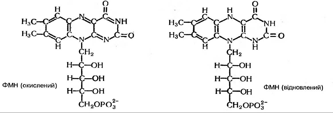 В ролі простетичної групи в них виступає похідне вітаміну В2 (рибофлавіну) — флавінаде- ніннуклеотид (ФАД) і флавінмононуклеотид (ФМН). Активною частиною флавінових дегідрогеназ є ізоалоксазинове кільце, до якого і приєднуються 2Н (2Н++2е-):