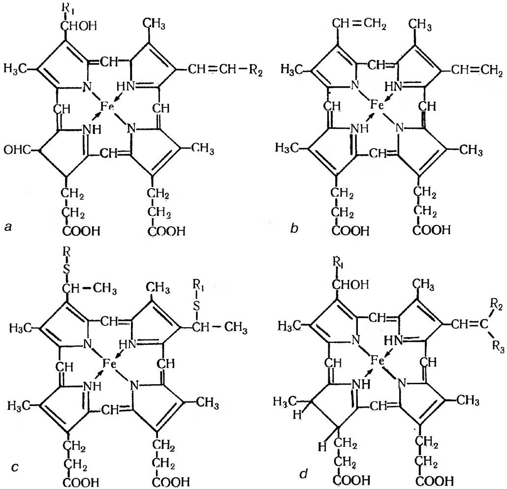 Рис. 86. Будова порфіринів цитохромів а, Ь, с і d