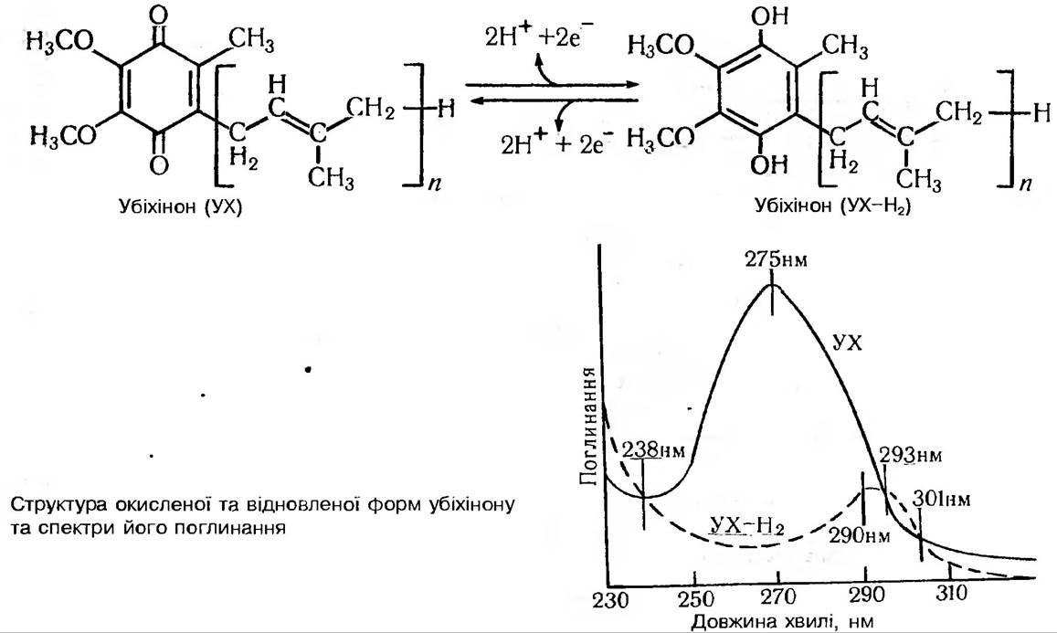 Цей термін вживають для позначення групи сполук, що мають те саме хіноїдне Ядро, але відрізняються кількістю ізопротеїдних залишків у складі бічної ліпофільної ланки вуглецевого ланцюга. Убіхінон відновлюється до убіхінолу, приєднуючи одночасно по два електрони та два протони. Саме тому убіхінон є «двохелектронною окислювально-відновною сполукою» та «переносником» Н2. Убіхінон — невелика молекула порівняно з білковими компонентами термінальної ланки ЕТЛ. До того ж, будучи ліпідом, він легко розчиняється і тому має змогу переміщатися в ліпідному матриксі мітохондріальної мембрани. Вміст його в мембрані відносно високий порівняно з цитохромами (5:1). Цими властивостями, можливо, і пояснюється його роль як колектора електронів ЕТЛ. Сюди стікаються всі електрони від різних донорів, щоб потім, в разі потреби, постачати їх в ланцюг цитохромам. Крім названих ферментів в перенесенні електронів беруть участь і залізо-сірчані білки. В їх склад входить комплекс Fe-S; залізо якого зворотно окислюється і відновлюється.