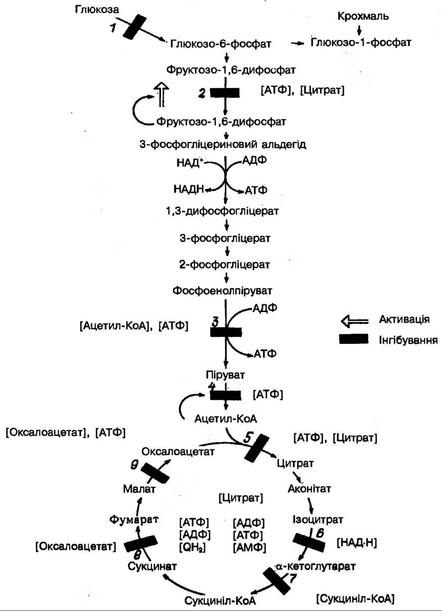1 — гексокіназа, 2 — фоофофруктокіназа, 3 — піруваткіназа, 4 — піруватдегідрогеназний комплекс, 5 — цитратоинтетаза, 6 — Ізоцитратдегідрогеназа, 7 — а-кетоглутаратдегідрогеназа, 8 — оукцинатдегідрогеназа, 9 — малатдегідрогеназа