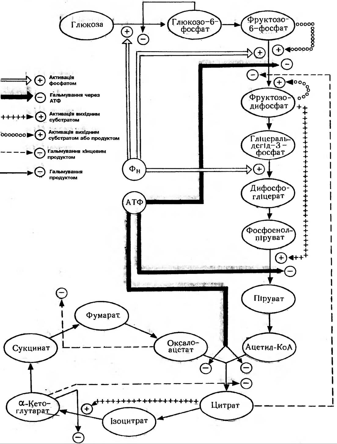Рис. 109. Шляхи регуляції функціонування системи ГЛІКОЛІЗ — цикл Кребса