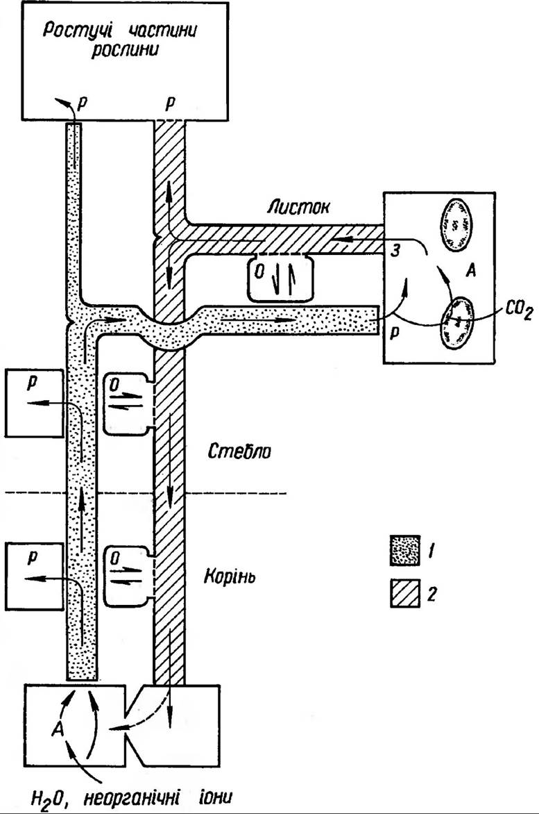 Рис. 124. Схема циркуляції води, неорганічних іонів та асимілятів у рослині. Вода та неорганічні іони, які були поглинуті коренем, пересуваються по ксилемі вгору з транспіраційним потоком. Деяка частина їх пересувається латерально в Тканини кореня і стебла, а вся інша транспортується до ростучих частин і зрілого листя. В листках значна кількість води і неорганічних іонів пересувається у флоему і виноситься з них разом з сахарозою у потоці асимілятів. Ростучі частини, які мають відносно малі можливості поглинання води за допомогою транспірації, отримують основну частину поживних елементів та води через флоему. І вода, і розчинні речовини, які потрапляютьу корені по флоемі, можуть переноситись до ксилеми. Літерою А позначені місця, які спеціалізуються на поглинанні та асиміляції вихідних матеріалів із зовнішнього середовища. Літери 3 і Р показують відповідно місця завантаження та розвантаження; О — основні точки, в яких відбувається обмін між ксилемою та флоемою: 1 — ксилема, 2 — флоема