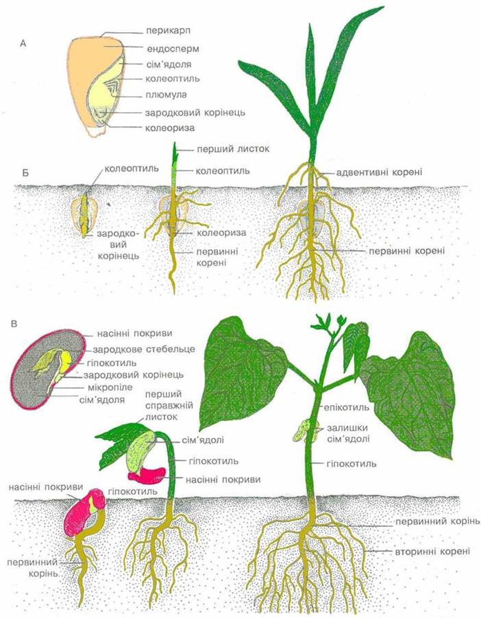 Рис. 26. Проростання насінини (А) і розвиток паростка однодольних (Б) та дводольних (В) рослин.