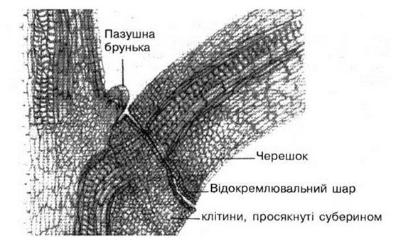 Рис. 30. Формування відокремлювального шару в черешку листка в період листопаду.