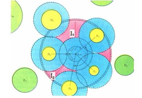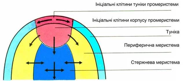 Вважається, що апікальну клітину (А.к.) і листкові примордії (П1-П5) , які формуються, оточують зони виділеного ними інгібітора поділу клітин. П6-П10 - примордії, які не виділяють ингібітора. Тільки в зоні І (ініціальній) концентрація інгібітора мінімальна, що допомагає закладці нового примордія.