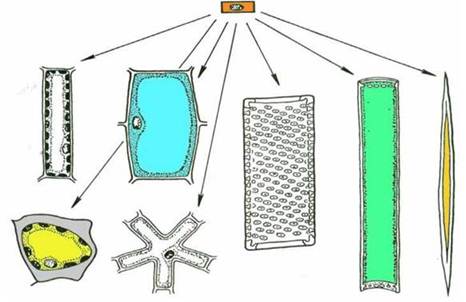 З однорідних меристематичних клітин можуть утворюватися різноманітні клітини постійних тканин (зліва на право): палісадні, замикаючі, паренхімні, «зірчасті», судини і ситовидні трубки, склеренхімні волокна.