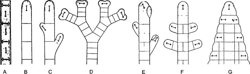 А—нитчатый таллом с интеркалярным ростом; В—рост посредством верхушечной клетки, С—то же с апикально-полярным ветвлением, D—вильчатое деление верхушечной клетки путем делений, периодически происходящих перпендикулярно направлению предыдущих делений, Е—субапикальное боковое ветвление путем неравного деления верхушечной клетки; F—боковое ветвление из сегментов, расположенных позади верхушечной клетки, G—благодаря срастанию боковых ветвей возникает плоский тканевый таллом