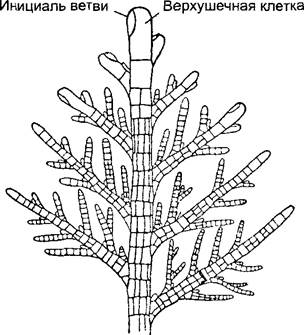 Когда в нитчатом талломе совершаются не только поперечные деления (веретено деления ориентировано вдоль), происходит ветвление (рис. 5.4, С —F). Ветви могут возникать из апикальной клетки, а также и из других клеток. Обычно соответствующие клеточные деления неравные, что ведет к иерархической системе ветвления: можно различить главную и боковые ветви, а при дальнейшем ветвлении — боковые ветви первого, второго и т.д. порядка (рис. 5.5). В результате клеточных делений, следующих, хотя и в одной плоскости, но в разных направлениях, может в конце концов образоваться плоский таллом. Из-за внешнего сходства с листом его называют филлоидом (см. рис. 5.4, G; 5.8, А).