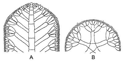 Рис. 5.7. Пластинчатые талломы красных водорослей (А—F.Oltmanns, В—по Rosanoff): А—верхушка ветви таллома Furcetlaria fästigiata (35x); В—однослойный таллом Metobesiaрастет веерообразно в одной плоскости благодаря нерегулярным продольным делениям краевых клеток(45х)