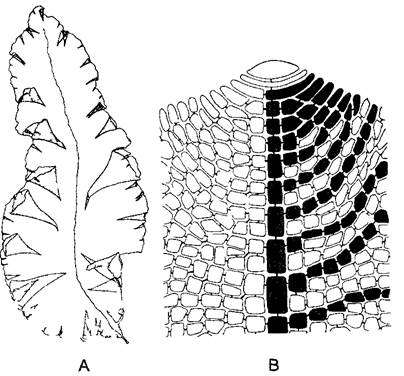 Рис. 5.8. Листовидный таллом красной водоросли Gnnellia americana (0,5х) (А) и передний конец однослойного таллома (В) с крупной верхушечной клеткой и образованной ею центральной нитью, последняя и некоторые отходящие от нее линии клеток зачернены (300х) (А—по R L Smith, В—по J Tilden)