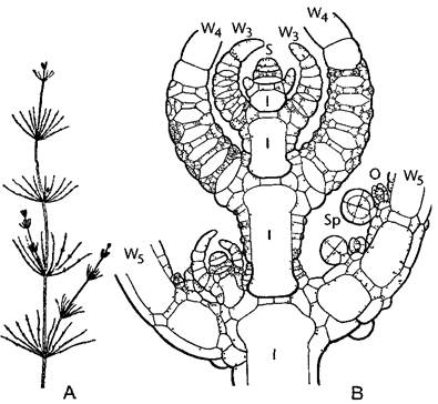 А—расчленение на узлы с мутовками ветвей и соединяющие их междоузлия На каждом узле может образоваться боковой побег (0,5х), В—продольный срез через верхушку таллома с апикальной клеткой Отчленяющиеся от нее клетки делятся вновь неравно на дистальную узловую клетку и базальную клетку междоузлия, которая обрастает корой из производных узловой клетки Клетки междоузлий во взрослом состоянии необычно крупные, в них наблюдается быстрое движение цитоплазмы Из наружных узловых клеток вырастают ветви мутовки (W3—W5), которые также расчленяются на узлы и междоузлия, на их узлах возникают оогонии и антеридии (30х), 1— клетки междоузлий, О—оогоний, S—верхушечная клетка, Sp—сперматогоний