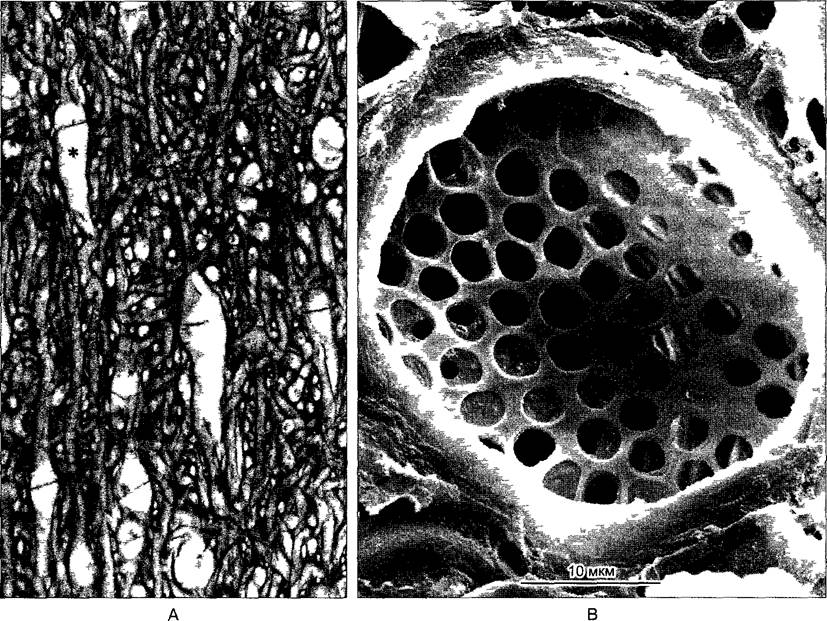 Рис. 5.10. А—переплетение клеточных нитей в каулодии бурой водоросли Laminaria, видны широкопросветные ситовидные гифы (одна из них обозначена звездочкой) с поперечными ситовидными пластинками (150х) В—ситовидная пластинка в плектенхиме бурой водоросли Macrocystis integrifolia (СЭМ-фотография К Schmitz)