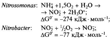 • Нитрификация. Нитрифицирующие бактерии являются строгими аэробами и окисляют NH3 или NH+4 с промежуточным образованием нитрита до нитрата (см. рис. 6.87). При этом работают две группы бактерий, тесно связанные экологически: виды нитрозогруппы (например, Nitrosomonas) преобразуют NH3 в нитрит, виды нитрогруппы (например, Nitrobacter) — нитрит в нитрат: