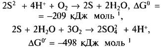 Эта реакция проводится, например, цианобактерией Веggiatoa и бактерией Тhiothrix, которые также временно запасают в клетках элементарную серу Виды в большинстве облигатного хемоавтотрофного рода Тhiobacillus окисляют различные соединения серы до сульфата. Наряду с Н2S, сульфидами и серой эти бактерии окисляют также сульфит (SО2-3), тиосульфат (S2O2-3), ди-, три- и тетратионаты (S2O2-6, S3О26, S4O26) и тиоцианат (SCN ), поэтому в очистке промышленных сточных вод естественным способом они играют очень важную роль Тhiobacillus thiooxidans, производя огромные количества Н2SO4, легко переносит высокую кислотность (до 1 Н серной кислоты)
