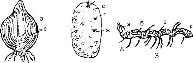 1 - цибулина, 2 - бульба, 3 - кореневище; а - брунька пагона, б - рубець пагона, в - стебло, г-листковірубці, д -додаткові корені, є - листкові луски, ж - пазушні бруньки