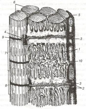 4-тріади; 5-сарколема; 6-міофібрили; 7-А-диск; 8-І-диск; 9-7-лінія; 10-мітохондрії.