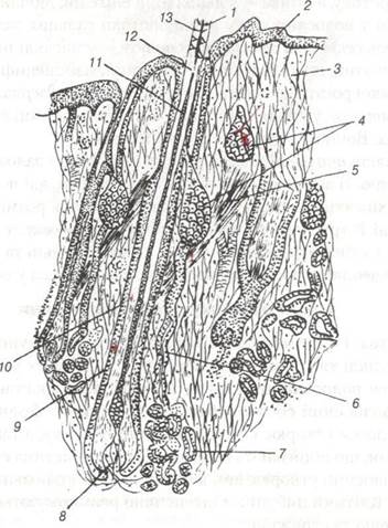 7- кінцевий відділ потової залози; 8-волосяний сосочок; 9-коренева Піхва; 10-сполучнотканинна волосяна сумка; 11-мозкова речовина волоса; 12-кіркова речовина волоса; 13-кутикула волоса.