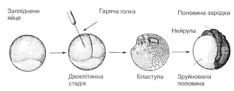 Рис. 11.10. Спроба В. Ру показати мозаїчність розвитку (за С. Гілбертом, 1994). Руйнування однієї з клітин у двоклітинного зародка призводить до розвитку лише половини зародка