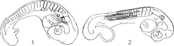1 - зародок гекона з 28-тулубовими сомітами; 2 - зародок вужа з 34-тулубовими сомітами