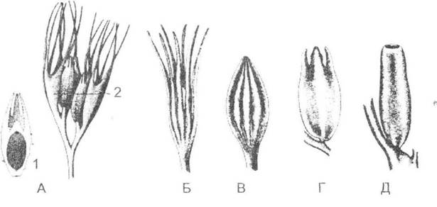 1 - розташування мегаспори в насінині; 2 - купули (бокалоподібні утворення, що охоплюють мегаспорангії). Простежується поступова заміна пальцеподібних виростів (Б) на інтегументні лопасті, які повністю зростаються (Д)