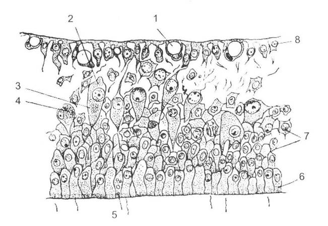 1 - веретеноподібна Клітина; 2 - дегенеруюча клітина; 3 - амебоїдна клітина; 4 - «спинний» епітелій; 5 - «черевний» епітелій; 6 - травна вакуоля; 7 - мітохондріальний комплекс; 8 — жир
