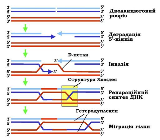 Необхідною умовою для здійснення гомологічної рекомбінації є гомологія послідовностей між двома молекулами ДНК по всій довжині. Загальну модель початкового етапу гомологічної рекомбінації зображено на рис. 1.26. Ініціюючою подією є дволанцюговий розріз в одній із гомологічних молекул (здійснюється спеціальними ферментами). Цей розріз за рахунок активності комплексу білків recBCD (тут і далі вказано назви білків, які забезпечують гомологічну рекомбінацію в E. coli, гомологічні білки є також і в еукаріотів) "розширюється" шляхом 5'-екзонуклеазної деградації ДНК - у результаті в місці розрізу залишаються два одноланцюгові 3'-хвости. Один із них (у комплексі з білком recA) здійснює інвазію - утворює подвійну спіраль з антипаралельним ланцюгом інтактної гомологічної молекули ДНК. Інший ланцюг цієї останньої виштовхується з дуплексу у вигляді одноланцюгової D-петлі (від displacement). Разом із 3'-хвостом D-петля здатна переміщуватись у пошуку гомології - максимальної комплементарності в межах подвійної спіралі, яка утворилася між ланцюгами двох гомологічних молекул ДНК. На наступному кроці відбувається репараційний синтез ДНК: два 3'-кінці розірваної молекули ДНК подовжуються ДНК-полімеразами з використанням як матриць двох ланцюгів інтактної молекули. До цього моменту схема на рис. 1.26 є одночасно схемою точної репарації дволанцюгового розриву в одній із двох сестринських молекул ДНК під час реплікації.