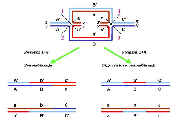 На рис. 1.28 зображено ізомеризовану чотириланцюгову структуру з рис. 1.26 - дві структури Холідея з перехрещеннями перетворені на планарні (ділянки, які синтезовані шляхом репарації, не позначено) - і результат її розділення. Із чотирьох можливих комбінацій розділення двох структур Холідея показано дві. Одна з них приводить до рекомбінації (аналогічно, рекомбінантною є і пара розрізів 2 + 4): дві гомологічні молекули ДНК обмінялися ділянками, і умовна "абетка", якою позначено фрагменти ДНК, змінює регістр - великі літери замінюються на маленькі та навпаки. У масштабі цілих хромосом результатом рекомбінації є дві молекули, показані в центральній частині рис. 1.29. Пари розрізів 1 + 4 і 2 + 3 не приводять до рекомбінації. Отже, рекомбінація при розділенні структур Холідея відбувається з імовірністю 50 %.