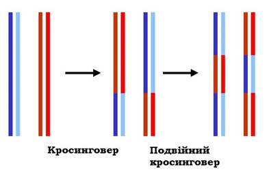 Рис. 1.29. Кросинговер як результат рекомбінації двох дволанцюгових молекул ДНК