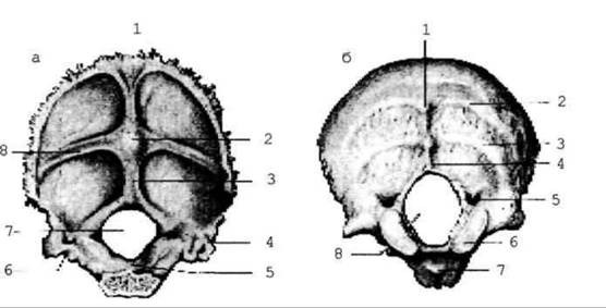 Рис. 2.8. Потилична кістка: а - вигляд спереду і зверху: