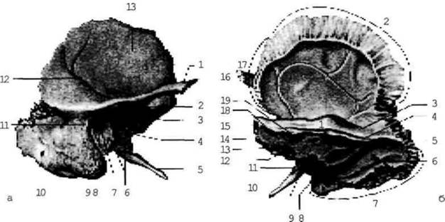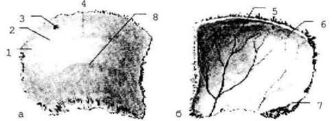 Рис. 2.14. Скронева кістка, трава; а — внутрішня поверхня, б - зовнішня поверхня.