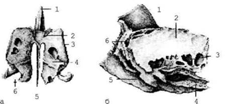 б - вигляд збоку: 1 - півнячий гребінь; 2 - очноямкова пластинка; 3 - задні решітчасті комірки; 4 - середня носова раковина; 5 - перпендикулярна пластинка; 6- передні решітчасті комірки.