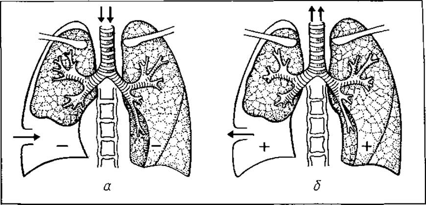 Мал. 50. Відкритий пневмоторакс: а — під час вдиху; б — під час видиху
