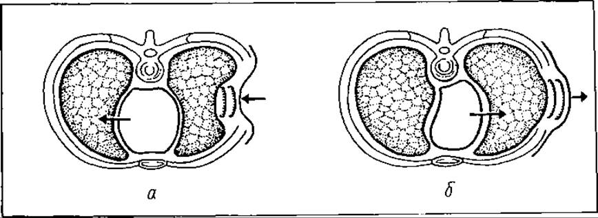 Мял. 52. Зміщення середостіння і «реберного клапана» у разі подвійного перелому Ребра: а — під час вдиху; б — під час видиху