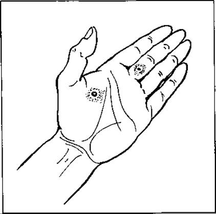 Клінічна картина електротравм. Характерними місцевими проявами у разі ураження електричним струмом є електромітки (мал. 61). У окремих випадках спостерігаються глибокі ураження з кратероподібним дном, яке може доходити до кістки.