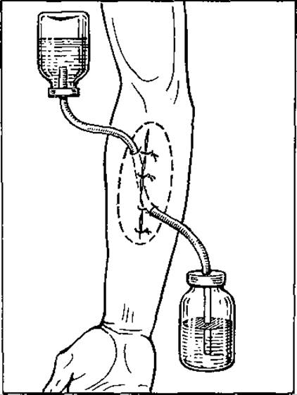 Мал. 64. Припливно-відпливне (промивне) дренування рани