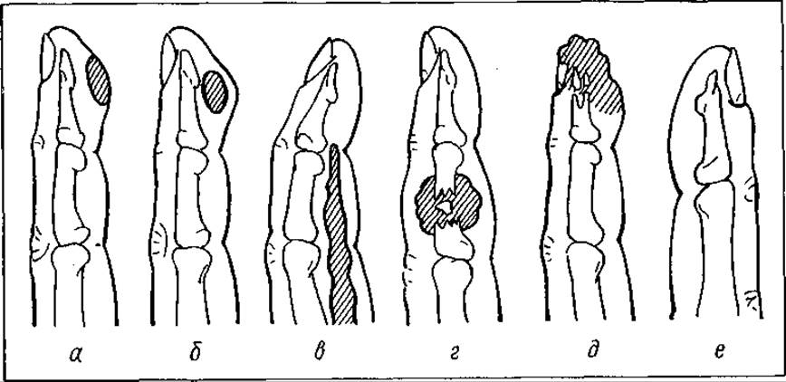 а — внутрішньошкірний; б — підшкірний; в — сухожилковий; г — суглобовий; д — кістковий; е — під- і принігтьовий