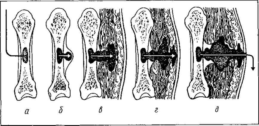 Мал. 74. Стадії розвитку гострого гематогенного остеомієліту: а — флегмона кісткового мозку; б — утворення підокісного абсцесу; в — міжм’язова флегмона; г — підшкірна флегмона; д — проривання гною на поверхню шкіри і утворення нориці