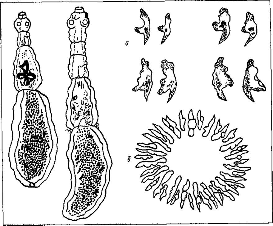 Мал. 110. Стрічковий гельмінт (Echinococcus granulosus). Статевозріла форма. а — гачки сколексу; б — крона гачків (К.1. Абуладзе)