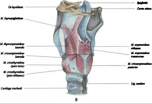 Рис. 284. М’язи гортані, muscuti laryngis: А - вигляд зліва; Б - вигляд ззаду