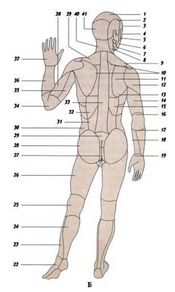 Б - вигляд ззаду: 1 - тім’яна ділянка; 2 - скронева ділянка; 3 - лобова ділянка; 4 - ділянка очної ямки; 5 - вилична ділянка; б - щічна ділянка; 7 - піднижньощелепний трикутник; 8 - груднино-ключично-соскова ділянка; 9 - акроміальна ділянка; 10 - міжлопаткова ділянка; 11 - лопаткова ділянка; 12 - дельтоподібна ділянка; 13 - бічна грудна ділянка; 14 - задня ділянка плеча; 15 - підреброва ділянка; 16 - задня ліктьова ділянка; 17 - задня ділянка передпліччя; 18 - передня ділянка передпліччя; 19 - долоня кисті; 20 - п’яткова ділянка; 21 - підошва стопи; 22 - тил стопи; 23 - передня ділянка гомілки; 24 - задня ділянка гомілки; 25 - задня ділянка коліна; 26 - задня ділянка стегна; 27 - відхідникова ділянка; 28 - сіднича ділянка; 29 - крижова ділянка; 30 - бічна ділянка живота; 31 - поперекова ділянка; 32 - підлопаткова ділянка; 33 - хребтова ділянка; 34 - задня ліктьова ділянка; 35 - задня ділянка плеча; 36 - задня ділянка передпліччя; 37 - тил кисті; 38 - передня ділянка плеча; 39 - надлопаткова ділянка; 40 - задня ділянка шиї; 41 - потилична ділянка