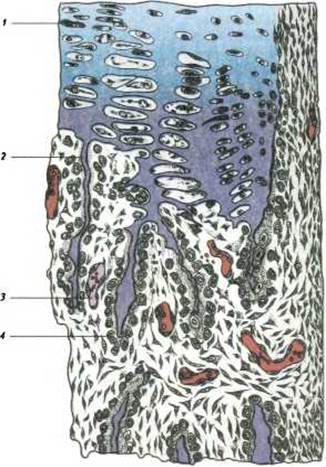1 - гіаліновий Хрящ; 2 - хрящова трабекула; 3 - кровоносна судина; 4 - остеобласт