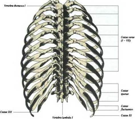 Ребра, costae [I—XII] (рис. 32), являють собою вузькі кісткові пластинки різної довжини, розташовані симетрично по обидва боки грудного відділу хребтового стовпа. У кожному ребрі розрізняють довшу кісткову, os costae та коротшу хрящову частину - ребровий Хрящ, cartilaqo costalis, а також два кінці: передній (груднинний) та задній (хребтовий).