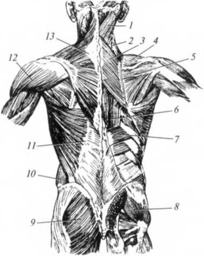 1 — ременная мышца головы и шеи; 2 — мышца, поднимающая лопатку; 3 — ромбовидная мышца; 4 — надостная мышца; 5 — подостная мышца; 6 — мышца, выпрямляющая позвоночник; 7— задняя нижняя зубчатая мышца; 8 — средняя ягодичная мышца; 9 — большая ягодичная мышца; 10 — наружная косая мышца живота; 11 — широчайшая мышца спины; 12 — дельтовидная мышца; 13 — трапециевидная мышца
