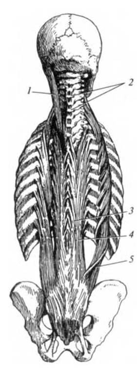 1 — ременная мышца головы; 2 — межостистые мышцы; 3 — остистая мышца; 4 — длиннейшая мышца; 5 — подвздошно-реберная мышца (отвернута)