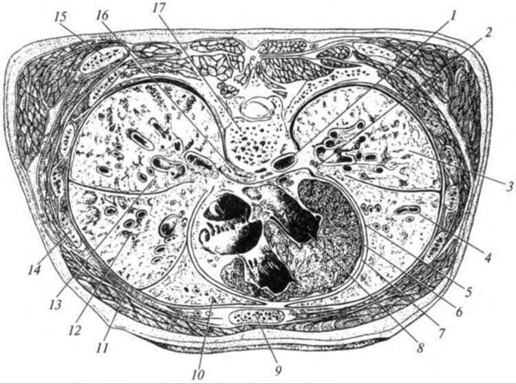 1 — аорта; 2 — ворота легкого; 3 — нижняя доля левого легкого; 4 — верхняя доля левого легкого; 5 — висцеральная Плевра; 6 — перикард; 7 — плевральная полость; 8 — сердце; 9 — грудина; 10 — верхняя доля правого легкого; 11 — реберная плевра; 12 — средняя доля правого легкого; 13 — нижняя доля правого легкого; 14 — ребро; 15 — нижний угол лопатки; 16 — пищевод; 17 — тело VI грудного позвонка