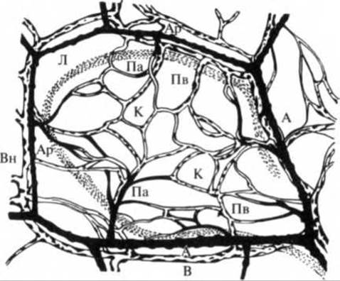 А — артерия; Ар — артериола; Вн — венула; Па — прекапиллярная артериола; Пв — посткапиллярная венула; К — капилляр; Л — лимфомикроциркуляторное русло; В — вена