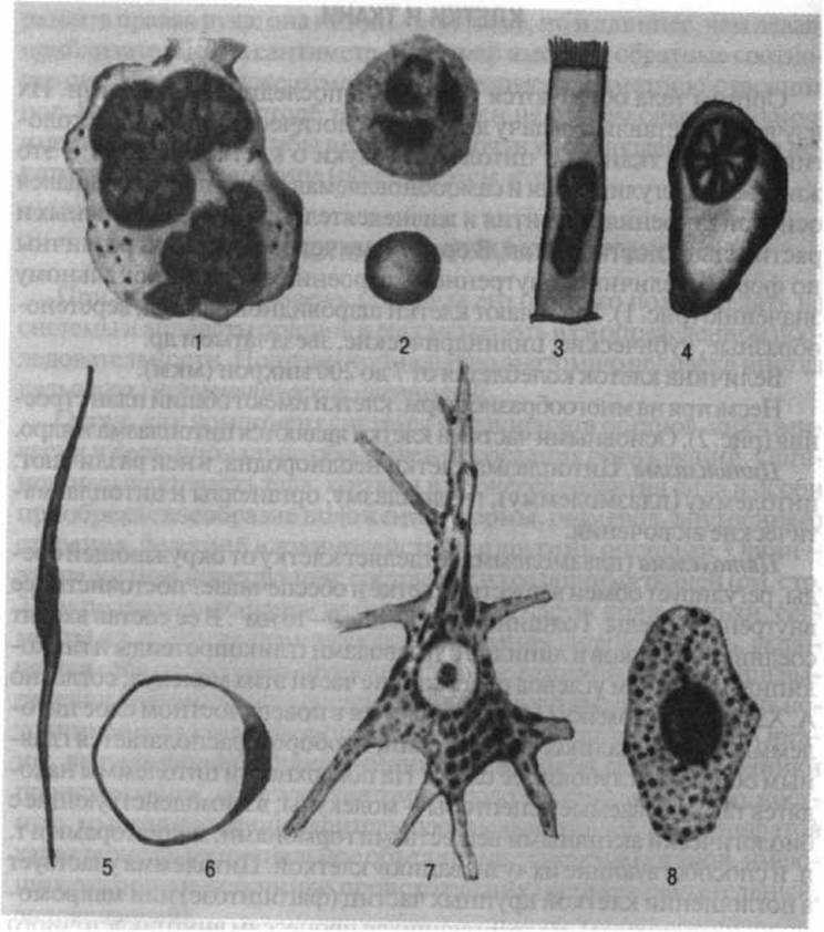 1 - мегакариоцит костного мозга; 2 - нейтрофильный лейкоцит (вверху) и эритроцит (внизу): 3 - клетка мерцательного эпителия; 4 - плазматическая клетка; 5 - гладкомышечная клетка; 6 - жировая клетка; 7 - нейрон; 8 - гепариноцит