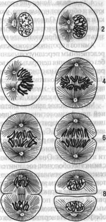 1 — клетка в покое; 2 профаза (ранняя стадия); 3 — профаза (поздняя стадия); 4 — метафаза; 5 — анафаза; 6 — телофаза; 7—8 — Разделение цитоплазмы и ядра